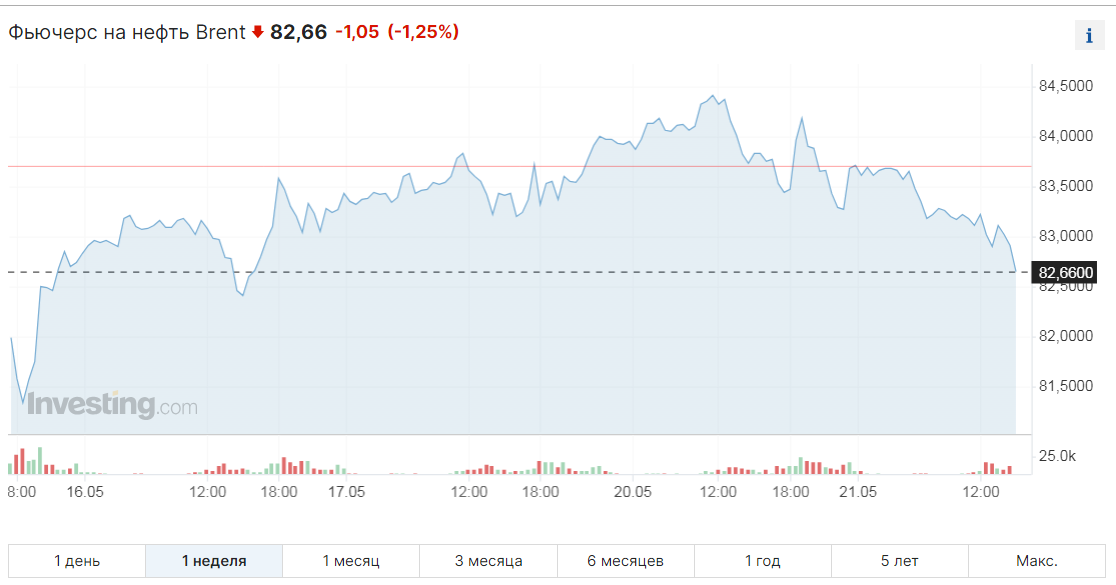 На прошлой неделе цены на нефть в основном демонстрировали рост. В ходе вчерашних торгов, 20 мая, цены на нефть марки Brent вырастали до 84,4 доллара за баррель. Но уже ко вторнику цены вновь снизились до 82,7 доллара за баррель.