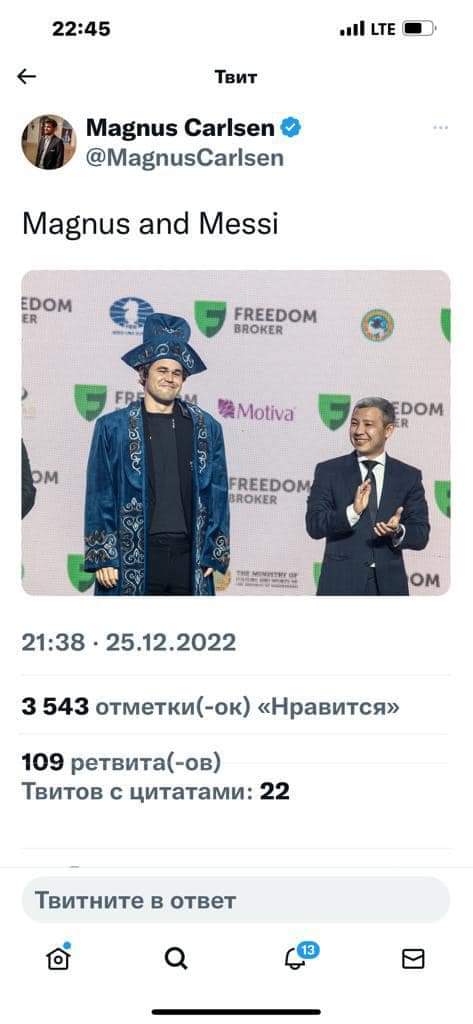 К слову, в твиттере Карлсен разместил свою фотографию в чапане и подписал ее: "Магнус и Месси", делая отсылку к финалу чемпионата мира по футболу. В Дохе после победы сборной Аргентины эмир Катара надел на Лионеля Месси традиционную арабскую одежду под названием "бишт".