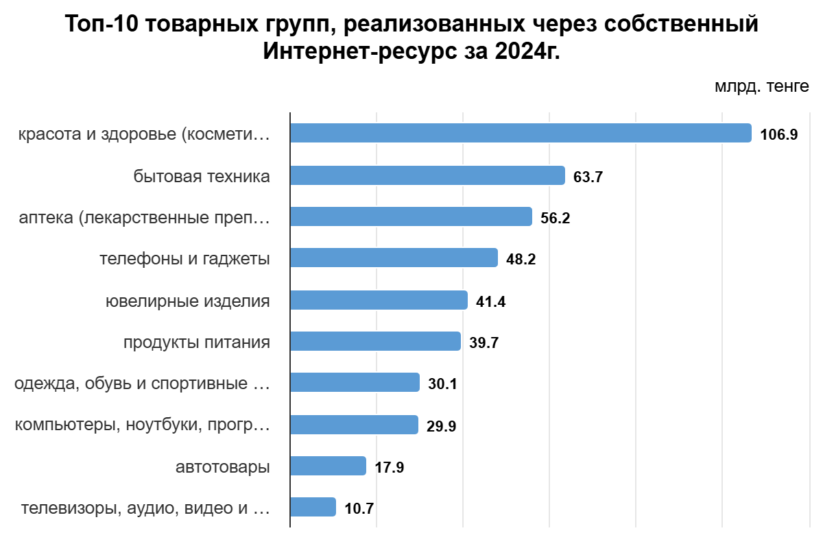 В розничной торговле наибольшая доля по реализации через собственный интернет-ресурс приходилась на косметику, парфюмерию (22,4%), бытовую технику (13,4%), аптеки (11,8%), телефоны и гаджеты (10,1%), ювелирные изделия (8,7%) и продукты питания (8,3%).
