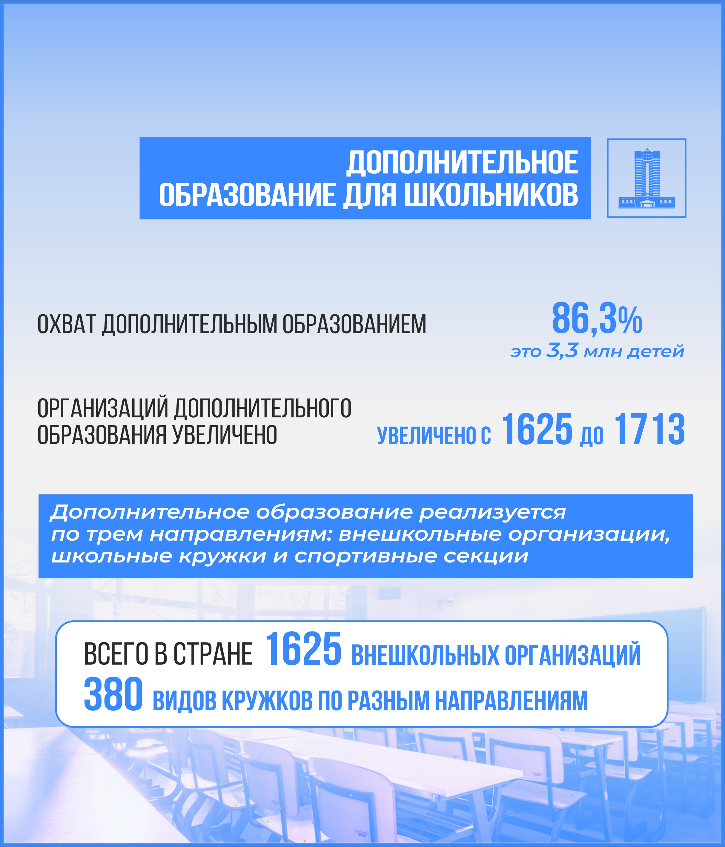 Президентом страны поставлена задача по возобновлению деятельности детских кружков. В этом году охват детей дополнительным образованием увеличен до 86,3% – это 3,3 млн детей, а сеть организаций дополнительного образования – с 1625 до 1713. В целом дополнительное образование реализуется по трем направлениям: внешкольные организации, школьные кружки и спортивные секции. Всего в стране функционирует 1625 внешкольных организаций и предлагается 380 видов кружков по разным направлениям.