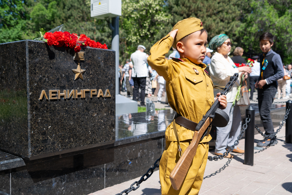 В честь праздника в парке были созданы десятки различных композиций, где горожане могли сфотографироваться на память. В том числе в образе "живых памятников", посвященных казахстанским героям войны.