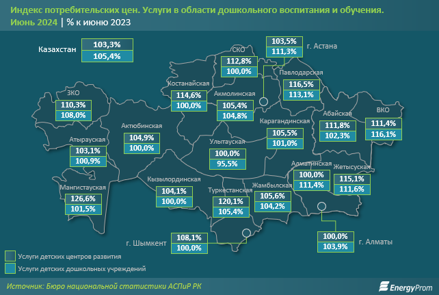 Услуги дошкольных организаций сильнее всего подорожали в Восточно-Казахстанской (на 16,1% за год), Павлодарской (на 13,1%) и Жетысуской (на 11,6%) областях. Наименьший годовой рост цен в этом сегменте был отмечен в Атырауской области: на 0,9%. В Актюбинской, Костанайской, Кызылординской и Северо-Казахстанской областях, а также в Шымкенте цены остались неизменными. В Улытауской области наблюдалось удешевление на 4,5%.