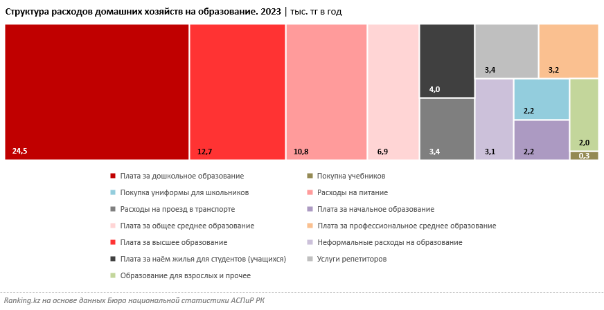 Примечательно, что в структуре семейных расходов плата за высшее образование по своему удельному весу меньше детсадовских и школьных расходов. Доля "студенческих" трат составляет всего 16,2%. В сравнении с расходами на некоторые частные детсады и школы среднего или элитного уровня платное обучение студента для родителей выходит дешевле. В национальных университетах годовая плата за обучение в текущем учебном году — от 1 млн тенге.