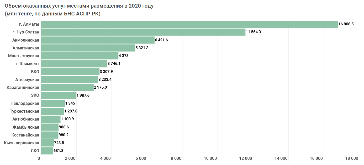 При этом в 6 из 17 регионов республики количество мест размещения пусть незначительно, но выросло. К ним относятся Атырауская (+1), Западно-Казахстанская (+6), Кызылординская (+4), Павлодарская (+2), Туркестанская (+11) области, а также Нур-Султан (+4). Наибольшее снижение произошло в Акмолинской области – тут количество мест размещения упало на 59 единиц.