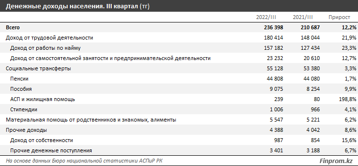 Доходы населения в третьем квартале 2022 года достигли 245,5 тыс. тг — на 16,5% больше, чем годом ранее, передает inbusiness.kz со ссылкой на Finprom.