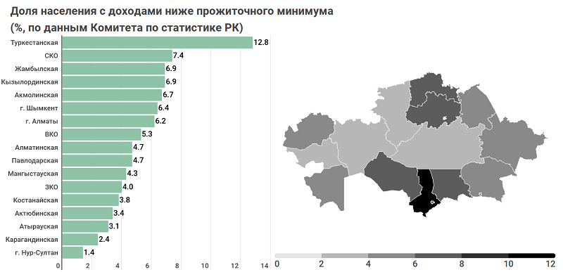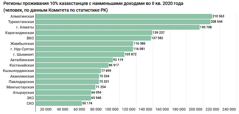 Большинство беднейших граждан Казахстана проживает на юге республики. Из общих 1,87 млн человек (относящихся к 10% с самым низким уровнем дохода) 210,6 тыс. человек проживают в Алматинской области, 208,5 тыс. – в Туркестанской, 195,7 тыс. человек – в Алматы. Таким образом, на эти три региона приходится треть от общего количества беднейших казахстанцев.
