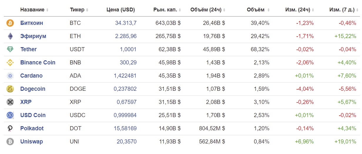ТОП-10 криптовалют по капитализации по состоянию на 5 июля 2021 года