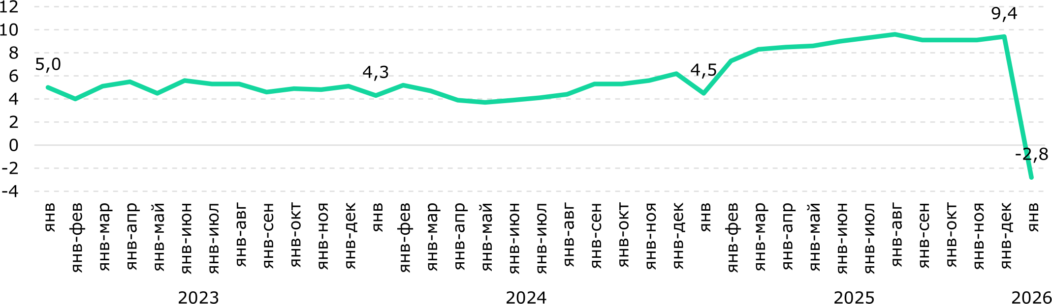 Сфера торговли, формирующая порядка 17% ВВП, за январь 2026 года показала рост на 2,9% г/г, замедлившись по сравнению с аналогичным периодом прошлого года (3,9% г/г).