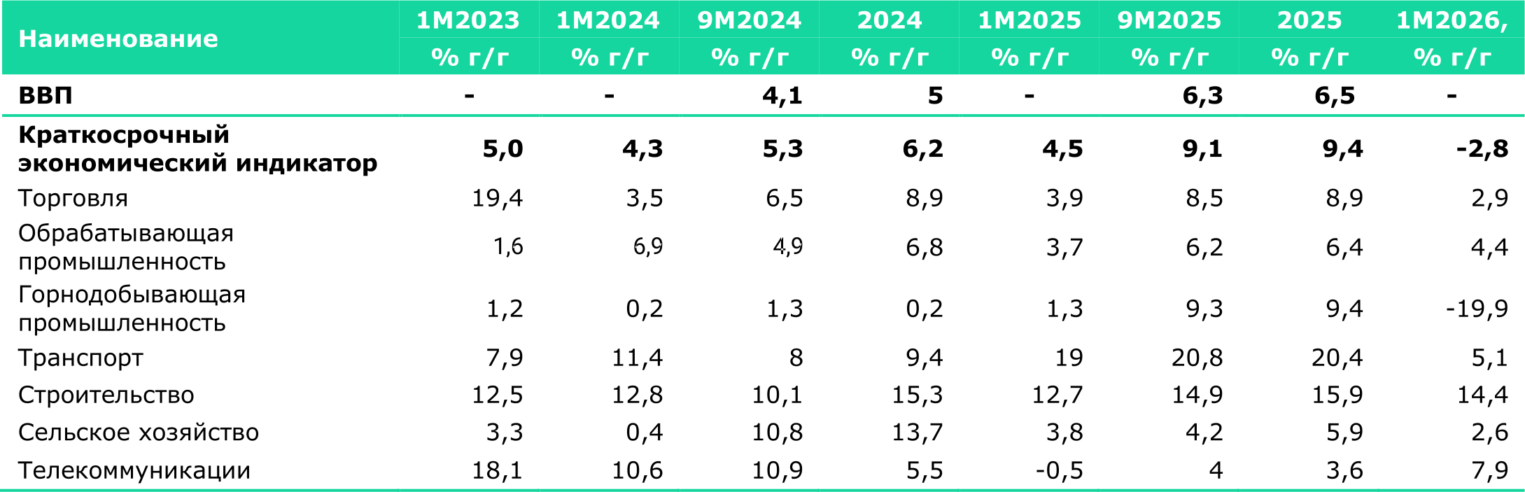"Отрицательная динамика индикатора в значительной степени обусловлена спадом в горнодобывающей промышленности, доля которой в структуре ВВП превышает 13%. В январе текущего года объем производства в секторе сократился на 19,9% г/г, что было вызвано существенным снижением добычи нефти и газа (-32,1% и -34,4% г/г соответственно). Данный спад через мультипликативные механизмы оказал сдерживающее влияние на темпы роста в смежных отраслях (Таблица 1). Сложившаяся тенденция подтверждает высокую чувствительность национальной экономики к конъюнктурным колебаниям в сырьевом сегменте и подчеркивает его определяющую роль в формировании общеэкономической динамики", – сообщает специалист аналитического центра Арслан Аронов.
