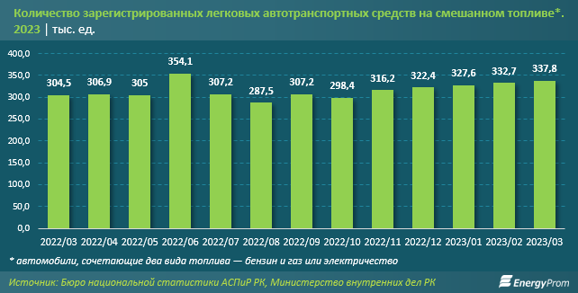 Кроме того, часть электрокаров в Казахстане — гибриды, которые имеют как бензиновый, так и электродвигатель. А по автомобилям на смешанном топливе МВД ведет отдельную статистику. Она включает в себя (без разделения на категории) электрические гибриды и машины, которые ездят на бензине и газе. На 1 апреля 2023 года транспорта, который ездит на смешанном топливе, было зарегистрировано 337,8 тыс. единиц. Определить в них долю электрогибридов не представляется возможным.
