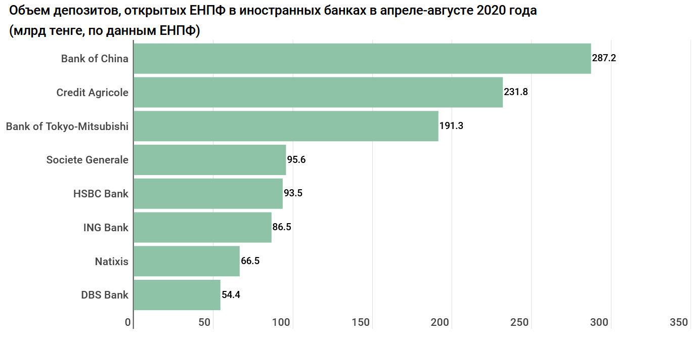 Таким образом, сумма вкладов в иностранных банках на 1 сентября 2020 года составила 555,66 млрд тенге. Это около 4,5% от общего объема инвестиционной корзины ЕНПФ.