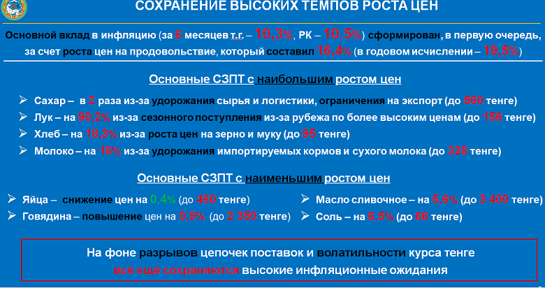 При этом снижение цен отмечается на яйца (на 0,4%, до 460 тенге) и незначительный рост цен наблюдается на говядину (на 0,9%, до 2350 тенге), масло сливочное (на 5,6%, до 3400 тенге), соль (на 6,5%, до 66 тенге). На фоне разрывов цепочек поставок и волатильности курса тенге все еще сохраняются высокие инфляционные ожидания.