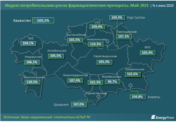 По итогам мая 2021 года цены на фармацевтические препараты выросли на 5,5% за год. Заметнее всего в годовой динамике выросли цены в Мангистауской области – на 20,5%. Среди всех регионов РК цены в секторе снизились только в Жамбылской области, но незначительно, всего на 0,3%, передает inbusiness.kz со ссылкой на портал energyprom.kz.