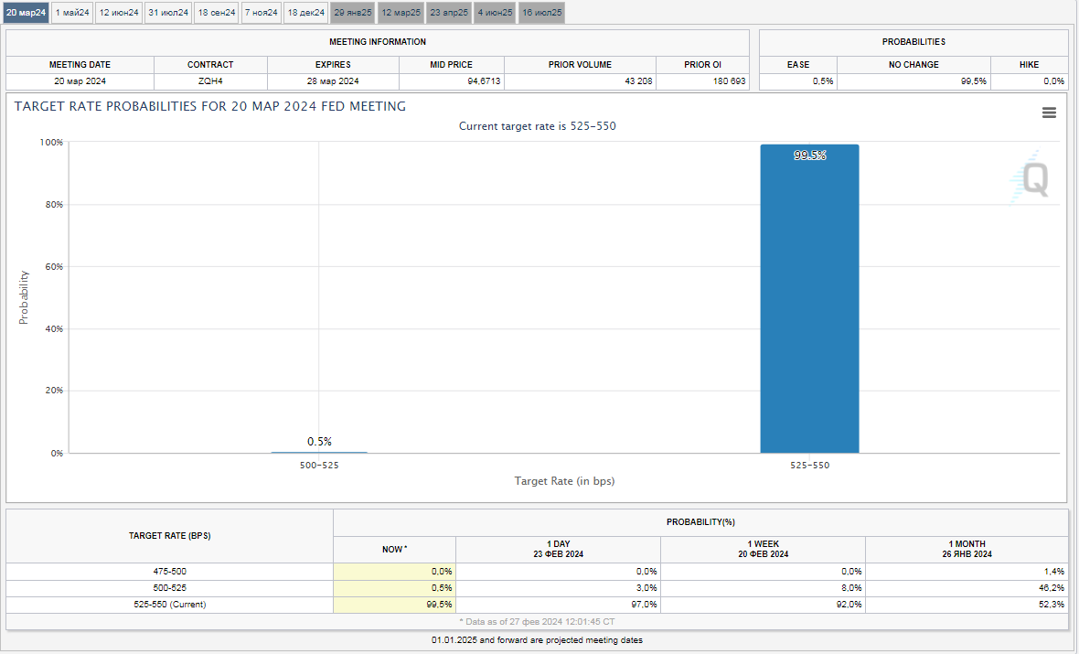 Вероятность повышения процентной ставки со стороны ФРС США на заседании 20 марта 2024 года