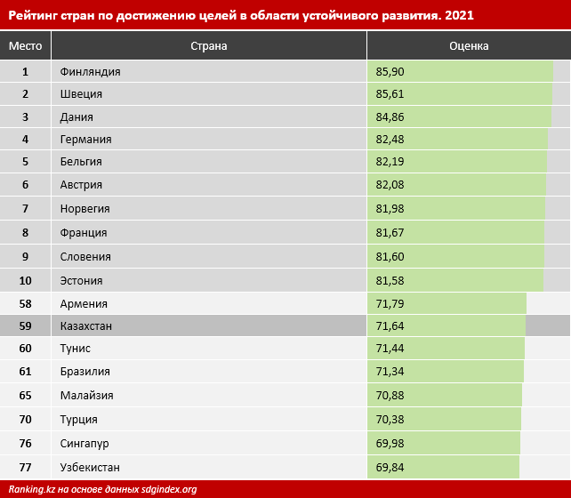 В глобальном рейтинге стран по достижению целей устойчивого развития за 2021 год Казахстан поднялся на 6 строчек и занял 59-е место (годом ранее — 65-е). Казахстан опережает в рейтинге такие страны, как, например, Бразилия, Малайзия, Турция, Сингапур и Узбекистан.
