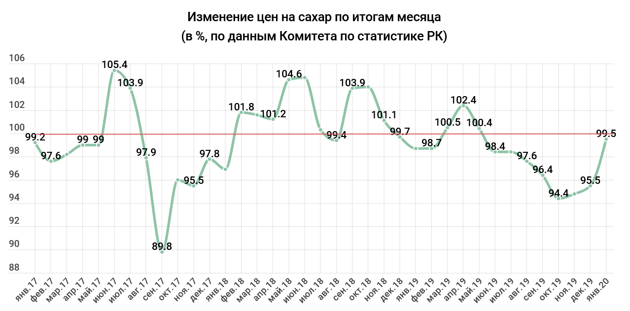 - Сахар теряет в стоимости с июня 2018-го (в январе – минус 0,5%). На падение цен обратил внимание даже Всемирный банк: тут советуют Казахстану поднять налог на содержащие его продукты. Это и поможет бюджету (даст до 182 млрд тенге), и отразится на здоровье населения.