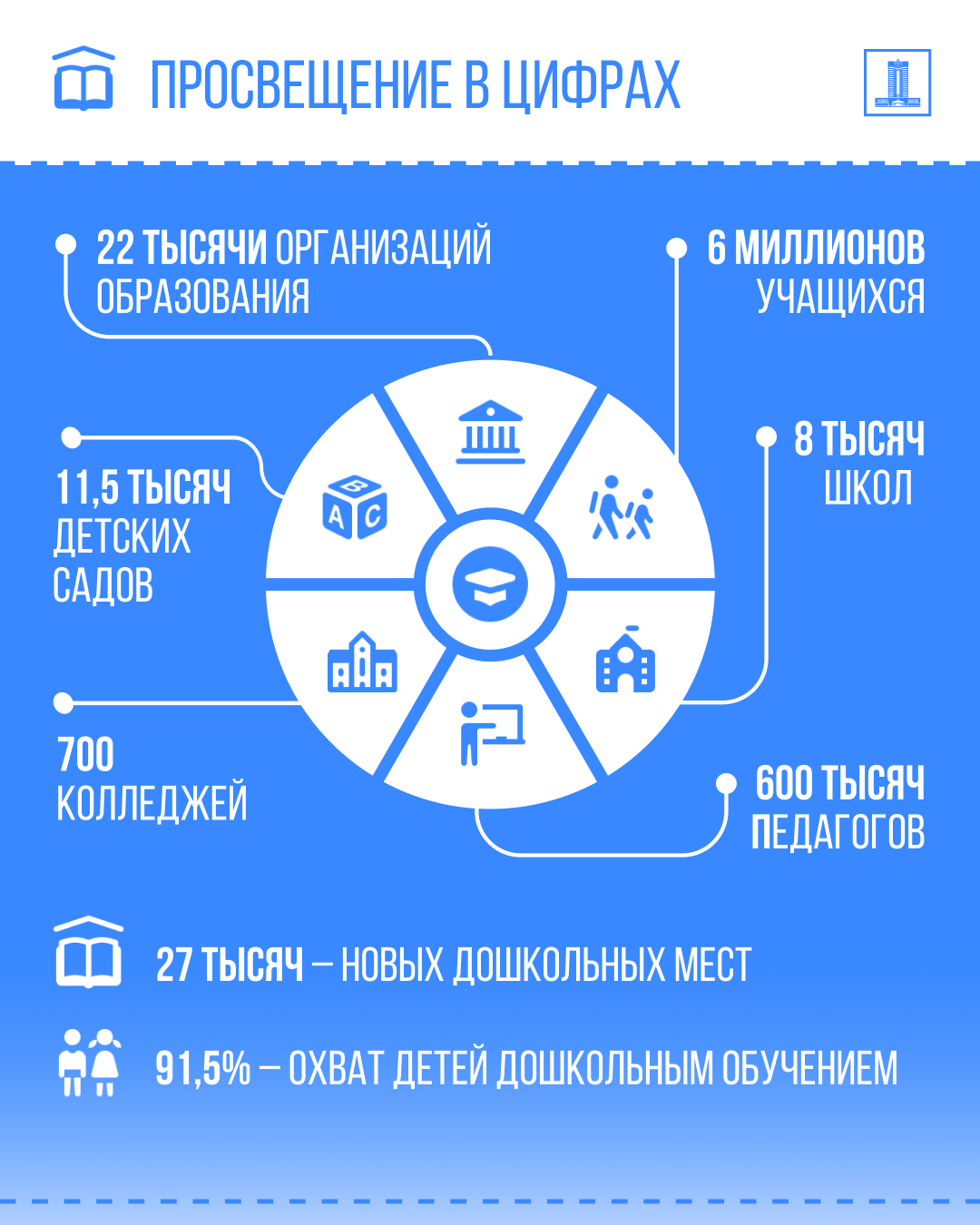 На сегодняшний день в ведении министерства просвещения находится 22 тыс. организаций образования, включая более 11,5 тыс. детских садов, 8 тыс. школ и 700 колледжей. Общее число учащихся составляет 6 млн, а педагогов – около 600 тыс.