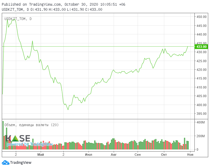 Баланс спроса и предложения на биржевых торгах KASE в пятницу вновь немного перевешивал в сторону покупателей иностранной валюты на фоне сохраняющейся высокой волатильности внешних рынков в преддверии президентских выборов в США и ускорения распространения Covid-19, сообщает Ассоциация финансистов Казахстана. По итогам валютных торгов средневзвешенный курс доллара США вырос до отметки 432,66 тенге за доллар (+0,35 тенге). При этом объем торгов особо не изменился и составил 119,8 млн долларов (-3,8 млн).