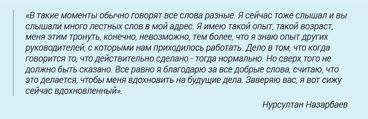 12.46 Руководитель АО "Усть-Каменогорский титано-магниевый комбинат" Асем Мамутова вспомнила, что еще недавно "мы думали о том, как доставить тепло в дома", а сегодня - "уже реализуем второй этап индустриальной программы". "Счастливая судьба независимости совпала с судьбой лидера нации, и все казахстанцы гордятся вами. Когда мы говорим "Назарбаев", мы выражаем все - и родину, и детей".