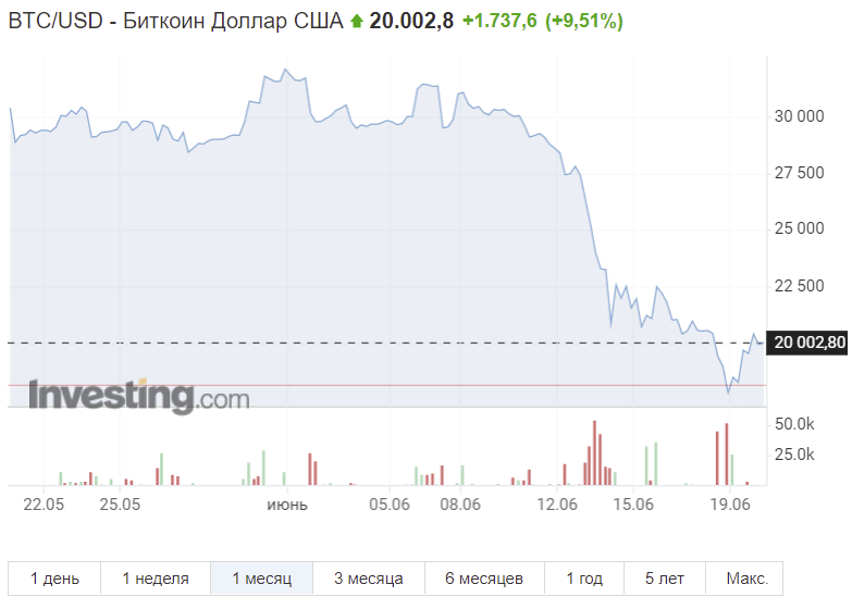 В целом на рынке сейчас наблюдается повышенная волатильность. Если за последние сутки биткоин прибавил почти 10%, то вчера на эти 10% он дешевел. Сейчас первая криптовалюта торгуется чуть выше 20 тыс. долларов, хотя вчера в моменте падала и ниже 17,6 тыс. долларов. В последний раз на таких уровнях биткоин находился в декабре 2020 года во время начавшегося бычьего цикла. Причем, что интересно, сейчас биткоин уже рухнул ниже максимума предыдущего цикла, который был в конце 2017 года. Тогда стоимость главной криптовалюты в моменте доходила до 19,7 тыс. долларов. Подобное падение произошло впервые в истории биткоина. Таким образом, за месяц биткоин подешевел примерно на 35%, а со своего исторического пика ноября 2021 года почти на 73%.