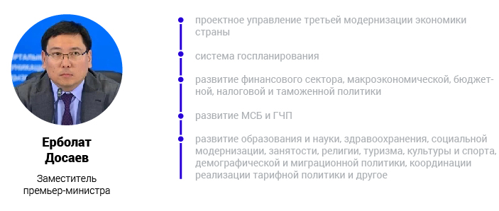 В сферу деятельности первого заместителя премьер-министра также отнесены вопросы координации развития специальных экономических и индустриальных зон, сотрудничества в рамках ЕАЭС. За заместителем премьер-министра Ерболатом Досаевым закреплены вопросы проектного управления третьей модернизации экономики страны, системы госпланирования, развития финансового сектора, макроэкономической, бюджетной, налоговой и таможенной политики, развития МСБ и ГЧП, а также развития образования и науки, здравоохранения, социальной модернизации, занятости, религии, туризма, культуры и спорта, демографической и миграционной политики, координации реализации тарифной политики и другие.