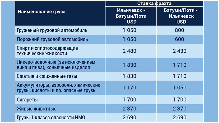 Паром Ильичевск (Украина)–Поти/Батуми (Грузия) – от 1000 до 2690 долларов США + дополнительная оплата 90 долларов США;