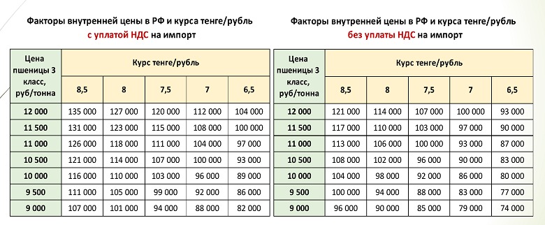 "Если внутренняя цена в РФ составляла 12 тыс. рублей при курсе 8,5 тенге за рубль, то цена в Казахстане стремилась к 135 тыс. тенге. Это цена за зерно с уплатой НДС. Если цена упадет до 11 тыс. рублей за тонну и снизится курс до 7,5 тенге за рубль, то цена будет уже 111 тыс. тенге. А мы помним, что недавно зерно продавали и по 180 тыс. тенге. Сейчас оно снизилось до 150 тыс. тенге и будет дальше снижаться. Такова ситуация по легальному экспорту. Но есть еще параллельно серый импорт, который не уплачивает НДС. И даже при цене в 12 тыс. рублей за тонну и курсе 8,5 тенге, цена ввоза составит 121 тыс. тенге. А это значит, что цена на рынке будет стремиться к этому меньшему показателю", – привел расчеты председатель союза Нурлан Оспанов.