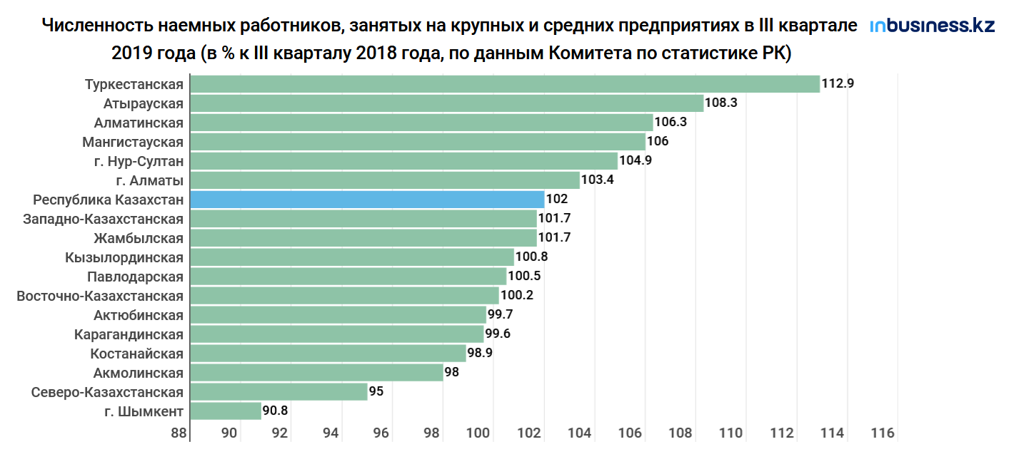 За год (III квартал 2019 года к III кварталу 2018-го) численность работников крупных и средних предприятий в Казахстане увеличилась на 2%, составив 2 млн 821,7 тыс. человек. Лидером по количеству остается Алматы, где на подобных предприятиях работает 439,9 тыс. человек. Меньше всего – в Северо-Казахстанской области (71,8 тыс. человек)