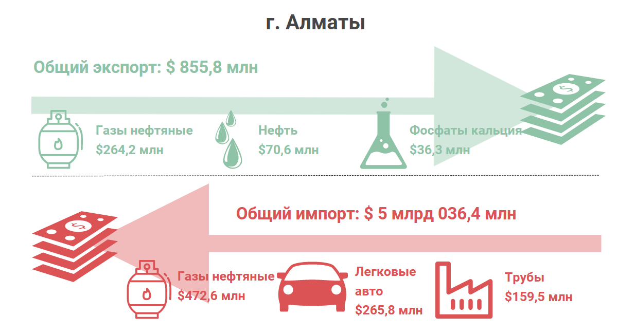 - Абсолютный лидер по импорту из стран союза – более $5 млрд. Каждый третий доллар, потраченный на ввоз товаров из ЕАЭС, приходится на Алматы.