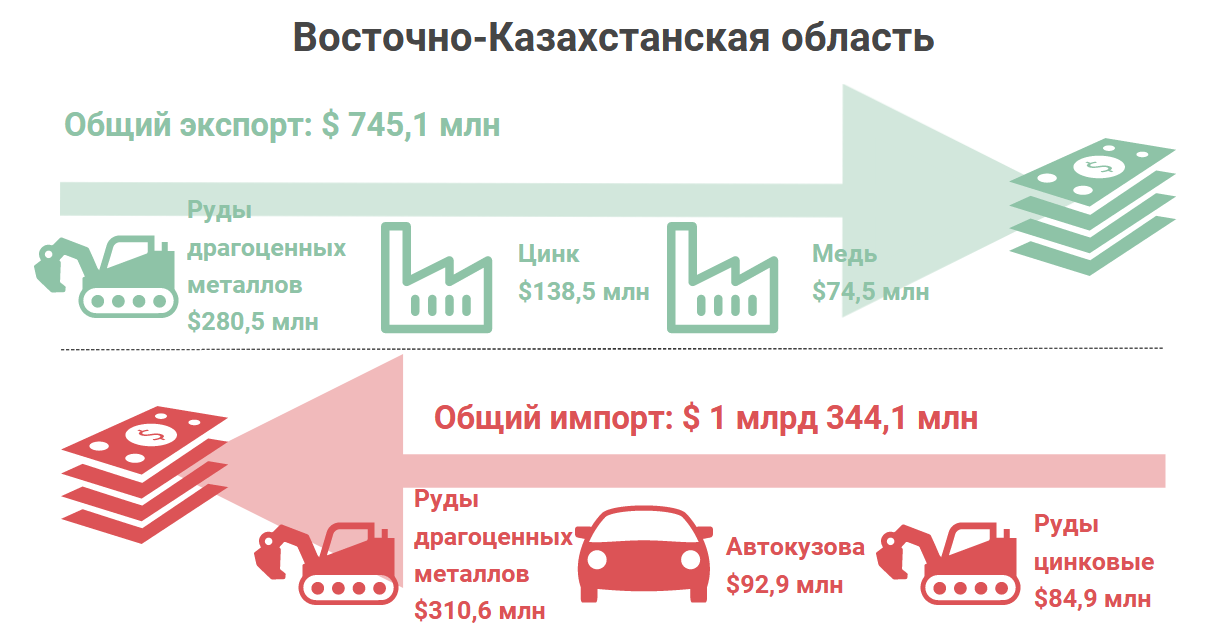 Удивительно, но именно этот регион лидирует по объемам импорта из Кыргызстана. В 2019 году в Восточно-Казахстанскую область было завезено товаров на общую сумму $110,1 млн – это 44% всего импорта из этой страны. Статистику делают руды и концентраты драгоценных металлов: в 2019 году физический объем поставок составил 49,2 тыс. тонн, а их стоимость – $98,4 млн. Вообще, руды драгметаллов играют важнейшую роль во внешней торговле региона: общий объем импорта составил $341,6 млн, экспорта – $280,5 млн.