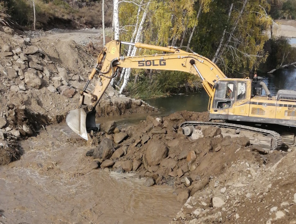 На месте работ котлованов уже не видно, нашему взору предстала земля, оголенная и подровненная. Основное русло реки Калжыр перекрыто. Вода идет по искусственному каналу.