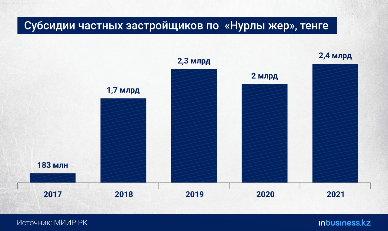 Всего с 2017 года по 2021 год застройщикам выплачено субсидий на 9 504 763 002,38 тенге. Самая высокая сумма приходится на текущий год и составляет 2,4 млрд тенге. В предыдущем году наблюдалось снижение госассигнований. Так, в 2020 году сумма субсидий стройкомпаний равнялась 2 млрд. Это на 300 млн тенге меньше показателя 2019 года.