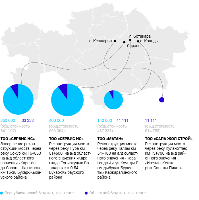 Наряду с областным бюджетом городами и районами области приняты меры по ремонту дорог за счет бюджетов местного уровня. Всего на эти цели акиматами городов Караганды, Темиртау, Жезказгана, Шахтинска, Сарани и Абайским, Актогайским, Жанааркинским, Каркаралинским районами выделено 3,3 миллиарда тенге, что позволит отремонтировать 64 км дорог.