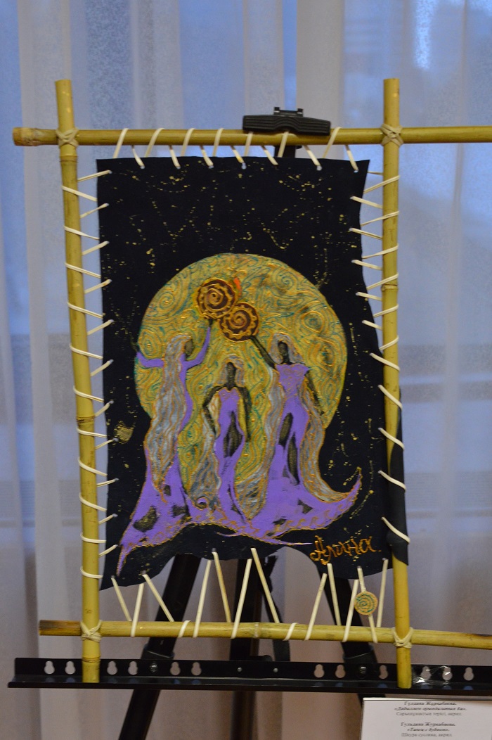 На новой персональной выставке "Путь к себе", открывшейся в Музее библиотеки Первого Президента РК, около 40 новых работ. Кожаных полотен немного. Сейчас у Гульданы в творчестве - новый период, на смену декоративно-прикладному творчеству пришла абстрактная живопись.