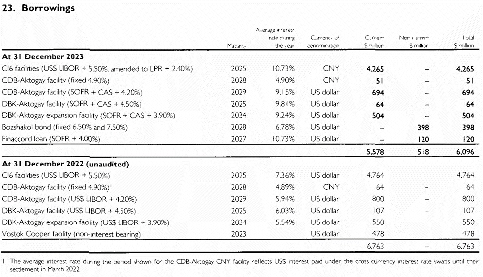 Судя по данным отчета, долг перед CI6 был конвертирован в юани в конце 2023 года. Изначально задолженность планировалось выплатить шестью квартальными траншами, начиная с апреля этого года, с окончательной проводкой в 75% кредитной линии, намеченной на октябрь 2025 года. Гарантами по этому долгу выступали Nova Resources и другие дочерние структуры Kaz Minerals, где акционерные пакеты в некоторых закладывались обеспечением. В апреле 2024 года начало выплат было передвинуто на октябрь и реструктурировано на четыре квартальных транша в течение года.