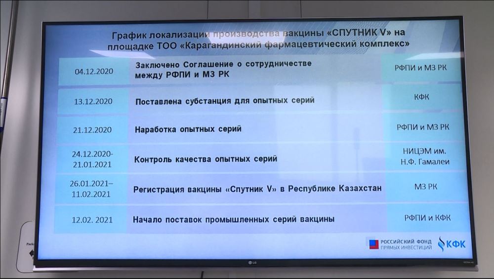 Далее руководитель Карагандинского фармацевтического комплекса пояснил журналистам, что 4 декабря 2020 года министерство здравоохранения РК подписало соглашение о сотрудничестве с владельцем технологии и ноу-хау – государственной компанией "Российский фонд прямых инвестиций".