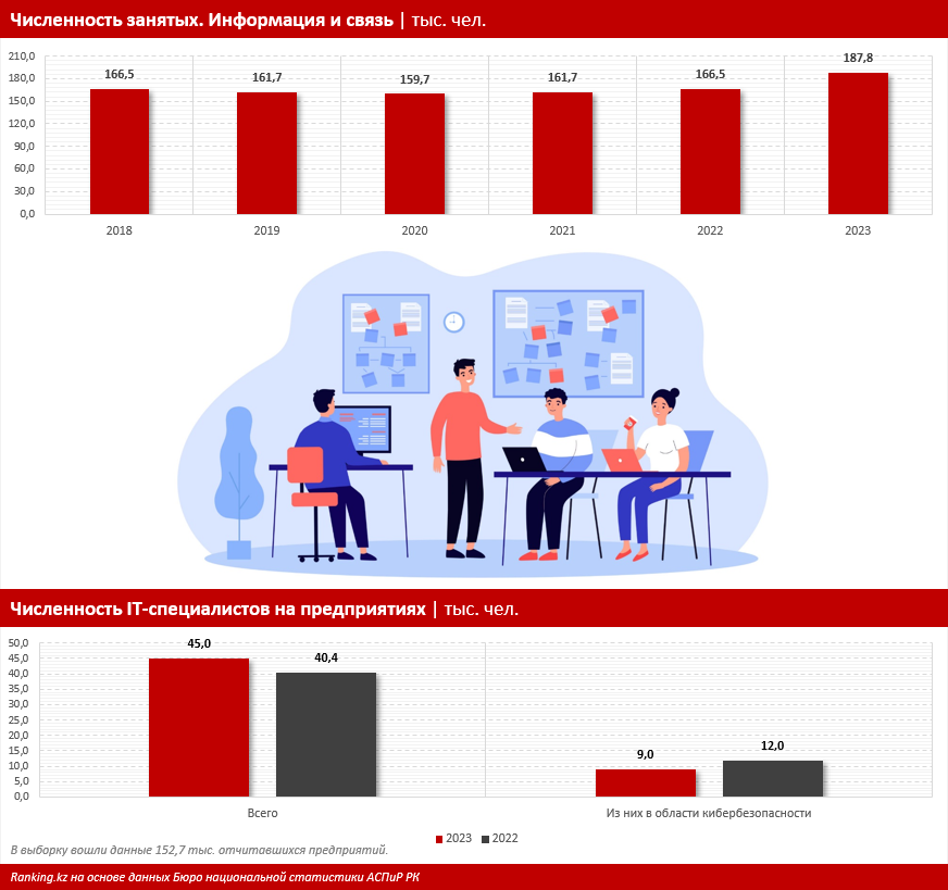 По данным бюро национальной статистики (БНС) АСПиР РК, в 2023 году в сфере информации и связи в РК работали 187,8 тыс. человек — на 12,8% больше, чем в 2022-м. Важно: в их число входят не только программисты, создатели сайтов, IT-инженеры, но и другие работники сферы коммуникаций, которые непосредственно к IT-продуктам отношения не имеют. Частично выделить из общего показателя именно специалистов информационно-коммуникационных технологий может помочь статистика предприятий. Судя по отчетам 152,7 тыс. компаний, в прошлом году численность IT-специалистов у них составила 45 тыс. человек. За год показатель вырос на 11,4%.
