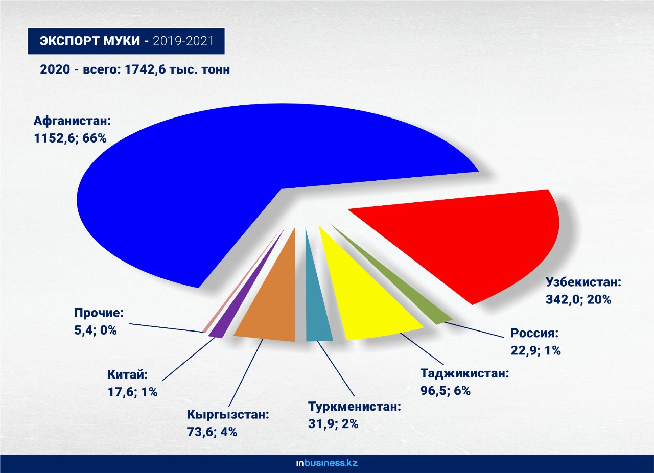 Что касается экспорта муки, то начиная с 2019 года объемы постепенно снижаются: в 2019-м было продано 1 млн 562 тыс. тонн, а в 2021 году уже 1 млн 443 тыс. тонн. Основными покупателями казахстанской муки как были, так и остаются Афганистан и Узбекистан, но объемы поставок сокращаются.