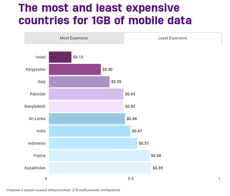 Страны с самой низкой стоимостью 1Гб мобильного Интернета
