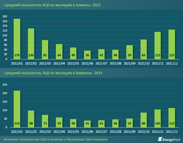 В Алматы и Бишкеке также наблюдается наибольшая разница в загрязнении воздуха зимой по сравнению с летними месяцами, когда воздух чище и лучше в четыре и три раза соответственно. За теплый период 2021 года время воздух был в среднем "хорошим" — AQI не превышал 50.
