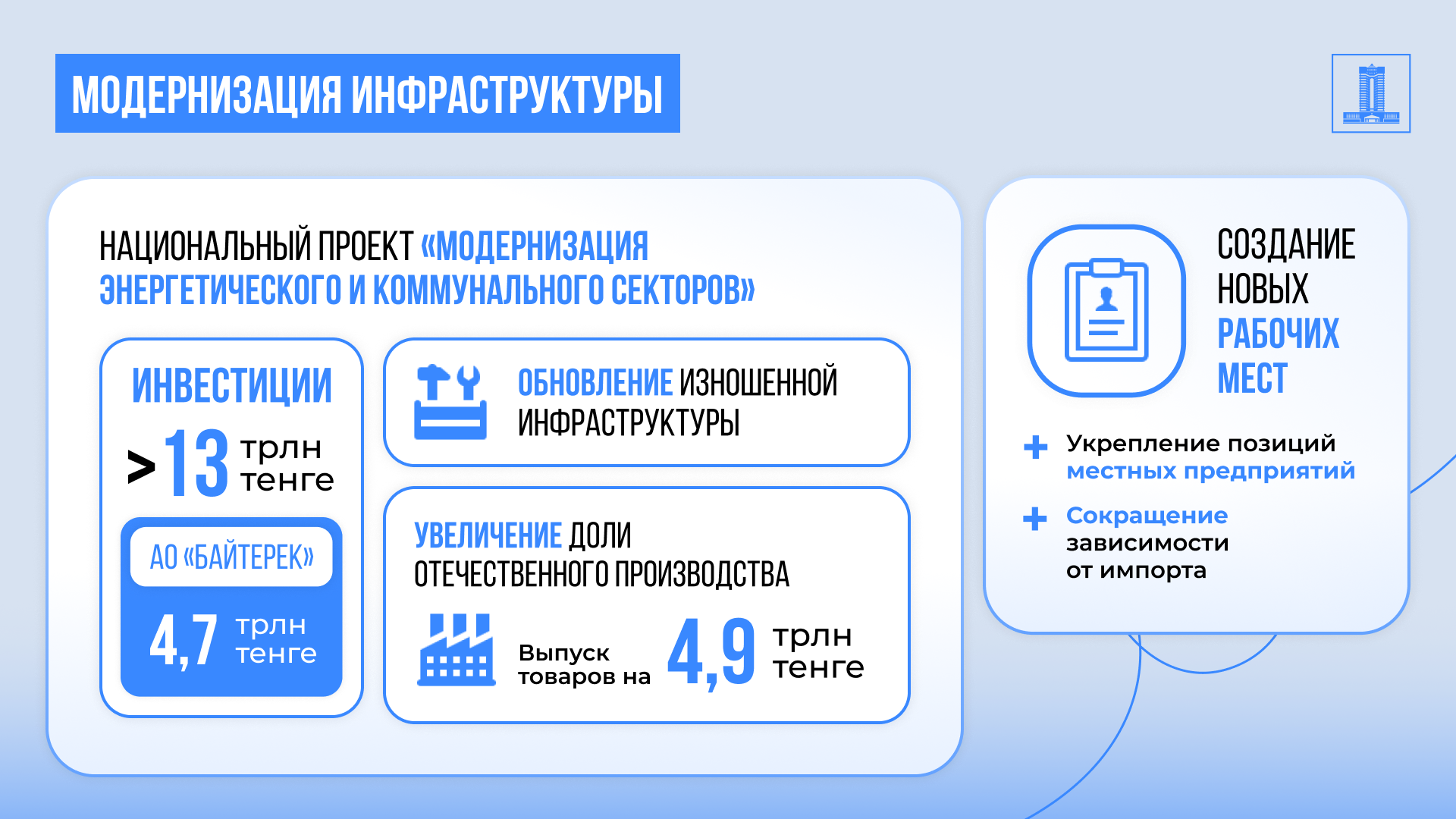 В рамках Национального проекта "Модернизация энергетического и коммунального секторов" для своевременного решения вопросов по снижению износа инженерных сетей в сфере жилищно-коммунального хозяйства предусматривается масштабное обновление изношенной инфраструктуры с общим объемом инвестиций свыше 13 трлн тенге, из которых 4,7 трлн тенге приходится на участие холдинга.
