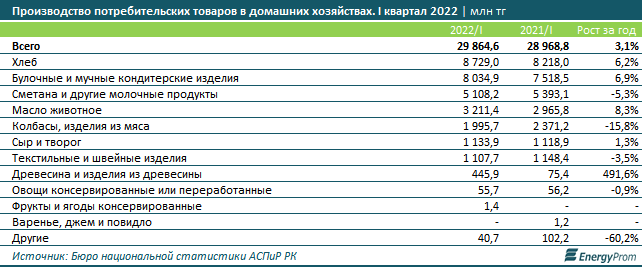 В первом квартале текущего года домохозяйства страны произвели собственной продукции на 29,9 млрд тг — на 3,1% больше в стоимостном выражении, чем годом ранее, передает inbusiness.kz со ссылкой на Energyprom.