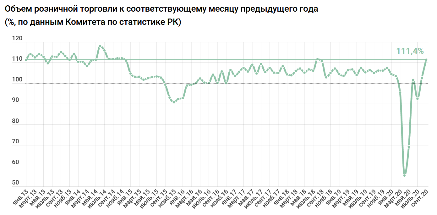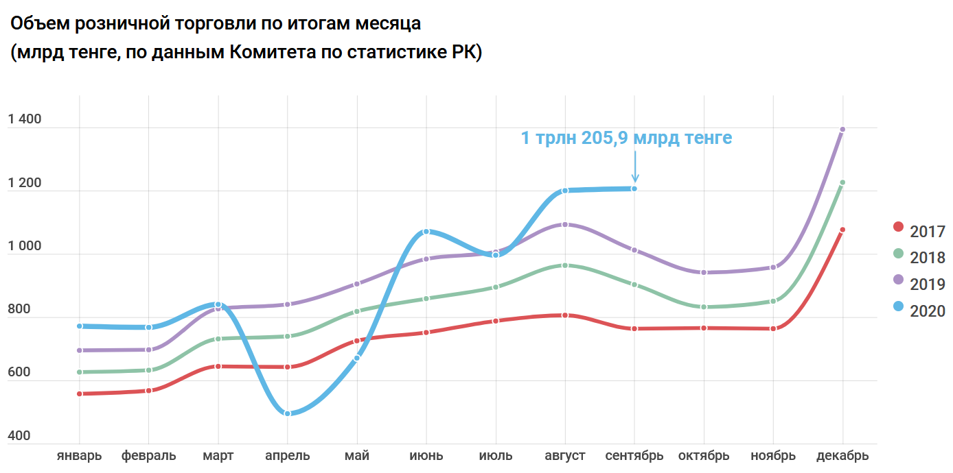 По данным комитета по статистике, в сентябре 2020 года объем сделок в розничной торговле в целом по республике составил 1 трлн 205,9 млрд тенге. И это крайне высокий показатель: