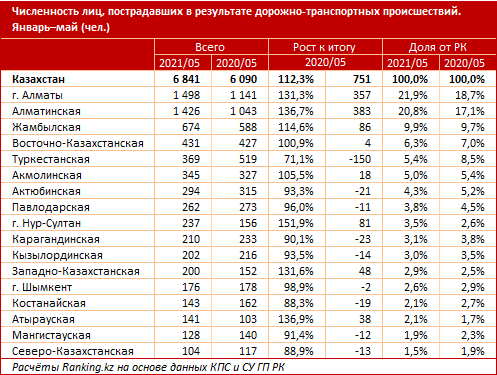 За январь-май 2021 года больше всего дорожно-транспортных происшествий зарегистрировали в Алматы: 1,3 тыс. случаев – на 32,5% больше, чем годом ранее. Далее идут Алматинская область (840 ДТП, плюс 27,5% за год) и Жамбылская область (425 ДТП, плюс 17,4%).