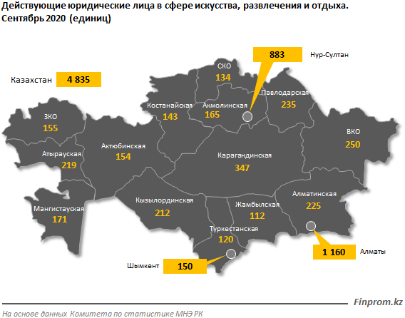 К 1 октябрю текущего года в стране было зарегистрировано 6,7 тыс. предприятий сферы искусства, развлечения и отдыха – на 2,8% больше, чем в прошлом году, сообщает портал finprom.kz.