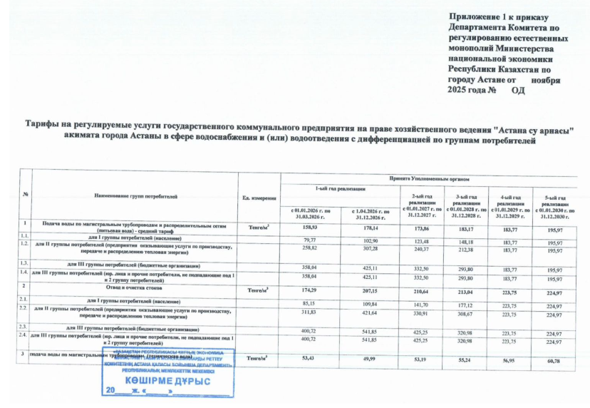 ГКП "Астана су арнасы" — монополист в сфере водоснабжения и водоотведения столицы. Тарифы утверждены приказом от 25 ноября 2025 года и также вводятся поэтапно.