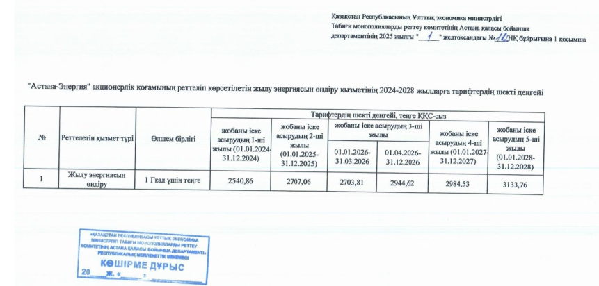 АО "Астана-Энергия" — производитель тепловой энергии — работает по предельным тарифам, утвержденным еще приказом от ноября 2023 года с внесенными в декабре 2025 года изменениями.