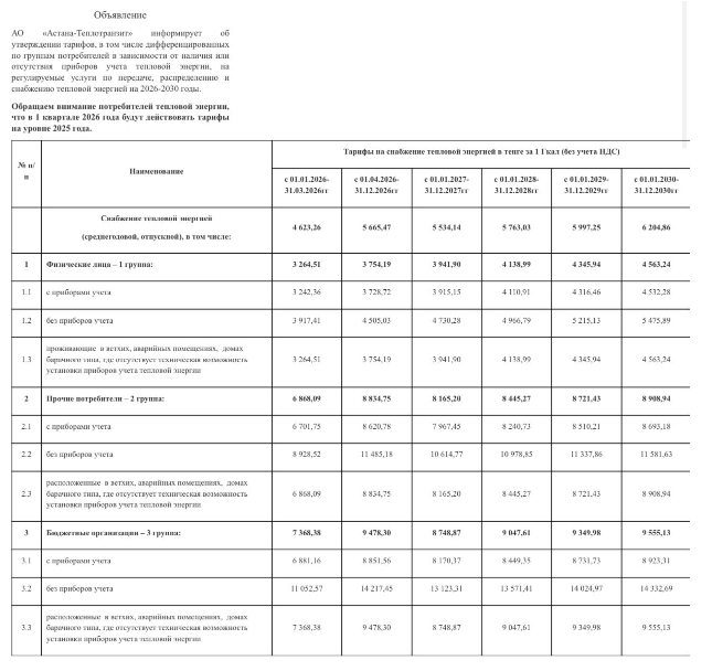 Акционерное общество "Астана-Теплотранзит" — главный поставщик тепловой энергии в столице. Согласно объявлению компании, в первом квартале 2026 года действовали тарифы уровня 2025 года. Теперь, с 1 апреля, вступают в силу новые ставки:
