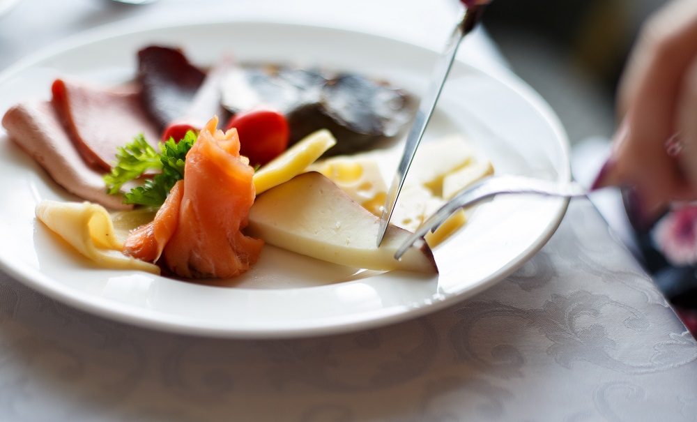 В итоге мы собрали вот такую тарелку из семги, сыра, ветчины и бекона.