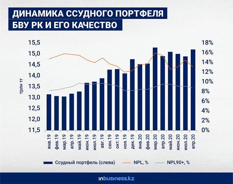 В номинальном выражении объем таких кредитов с начала года вырос на 10%, уточняют в инвестбанке, однако за счет общего роста кредитного портфеля их доля снижается. Среди банков наибольшая доля неработающих кредитов сосредоточена в Jysan Bank (44,7%), Азия Кредит (50,8%), Tengri (59,9%) и Capital Bank (90,4%).